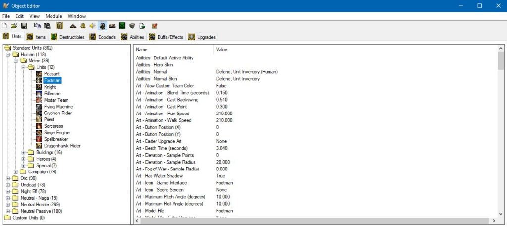 - Editor. A few values that mostly just make the unit easier to manage in the World Editor; for example, which tileset menu you might find a unit in.